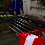 Gerade hatten wir die Skulls der „Eva Colby“ in den Hansa-Farben gestrichenen, was ziemlich aufwendig war, da kamen 8 Paar nagelneue Skulls für die Trainingsabteilung in die Werkstatt. Die Skulls werden mit einem speziellen Zwei-Komponenten-Lack gestrichen. Dieser Lack muss in einem bestimmten Mischungsverhältnis angerührt und kann dann nur wenige Stunden verarbeitet werden. Zur Vorbereitung muss die Oberfläche der Skulls mit Schleifpapier aufgeraut werden. Sehr aufwendig ist das Abkleben der verschiedenen roten und weißen Felder.