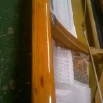 Viel Arbeit hat uns das Abdecken des Bootskörpers mit Zeitungspapier zum Schutz gegen Lacktropfen (Siehe Foto 3) gekostet aber das hat sich gelohnt! Insgesamt haben wir in fünf Lackschichten aufgetragen und so die Leiste wieder gegen Beschädigungen und den Eintritt von Feuchtigkeit geschützt. (Fotos 4-7)