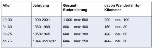 Das Präsidium des Deutschen Ruderverbandes hat beschlossen, dass aufgrund der aktuellen Situation der Corona-Krise und der damit einhergehenden Einschränkungen und Verbote zur Ausübung des Rudersports, die Ausschreibung des Fahrtenwettbewerbs für Erwachsene 2020 angepasst wird. Alle für das Fahrtenabzeichen geforderten Kilometerleistungen werden um 50% reduziert.