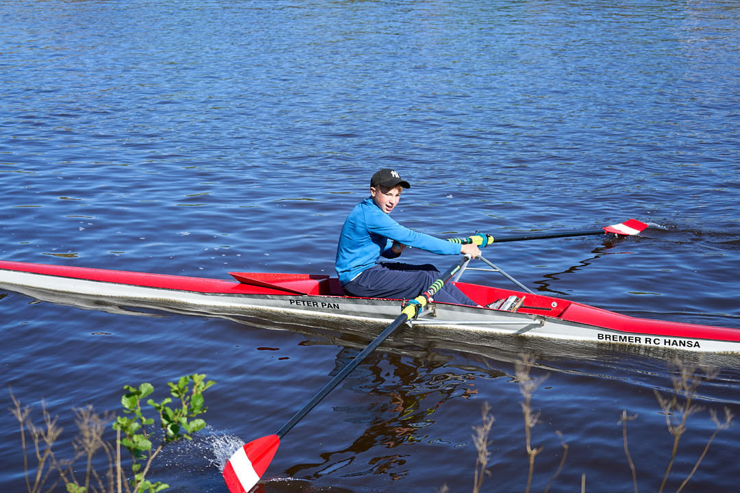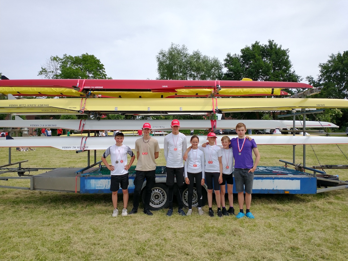 Anfang Juni fuhren wir nach Hamburg zum Landesentscheid für die Bremer Kinder, gemeinsam mit den Ruderjugenden aus Hamburg, Niedersachsen und Mecklenburg-Vorpommern. Da es hier um die Qualifikation für den Bundeswettbewerb (BW) der Kinder ging, reisten wir mit einem etwas kleineren Team an: Sophie (1x 13/14 LG), Theo und Samuel (2x 12/13 LG), Luk (1x 13/14 LG), Anton und Janick (2x 13/14). Die eher dünn besetzte Konkurrenz aus Bremen war kein Problem, sodass am Ende alle Boote sowohl auf 3000m als auch auf 1000m den Titel „Bremer Landesmeister*in“ errudern konnten. Im Vergleich mit den anderen Bundesländern offenbarte sich jedoch, dass wir noch einiges zu tun haben, um mithalten zu können. Am Ende konnten wir Luk im Einer und Anton und Janick im Zweier für den Bundeswettbewerb nominieren.