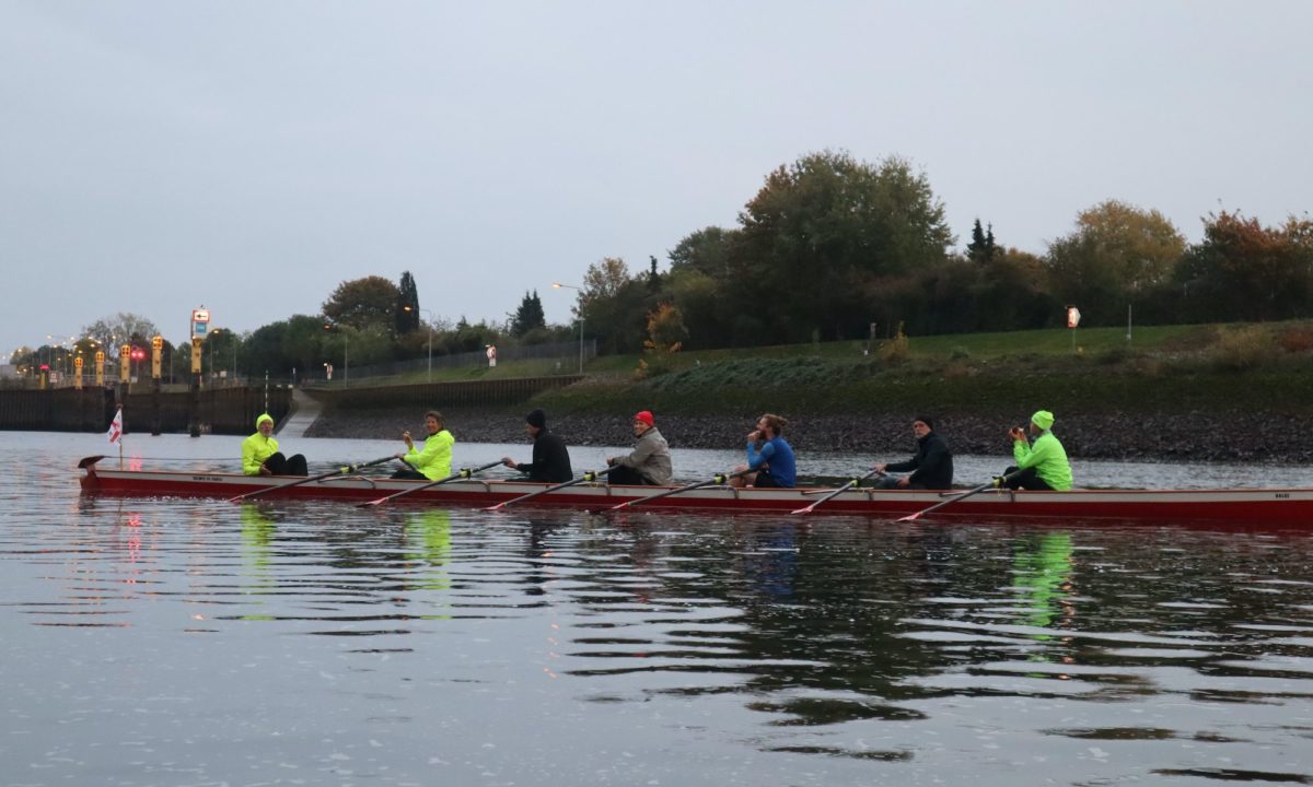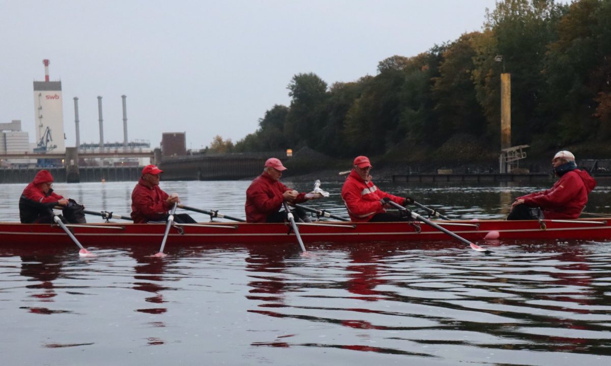Wir trafen uns am 20. Oktober zum gemeinsamen Freimarktsrudern und hatten nur teilweise Glück mit dem Wetter, denn im Laufe des Abends regnete es mehr und mehr. Dank eifriger zusätzlicher Landunterstützung kamen unser Sechser und vier Fünfer gut zu Wasser, samt Knicklichtern und