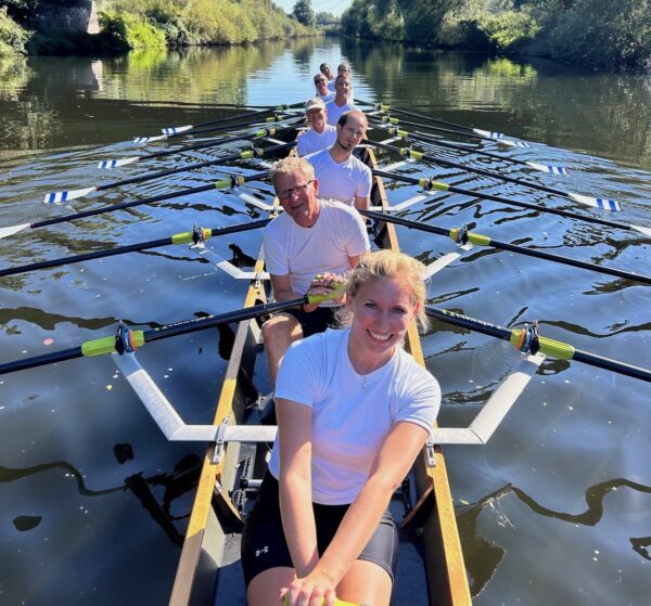 Es kostete Nerven, aber das Boot des HRC entschädigte alles: Drei Jahre alt, Flügelausleger, Karbon. Die ersten Startschläge fühlten sich fantastisch an und mit einer Schlagfrequenz 25/26 fuhr die Mannschaft sicher bis „Dornröschen“ – 800 Meter vor dem Ziel. Jetzt hieß es Schlagfrequenz hoch und Endspurt. Wir haben die schnellste Zeit aller Gig-Doppelachter gerudert und gewonnen: Kim, Jörn, Sebastian, Andrea, Moritz, Elke, Volker, Miriam und Traude.