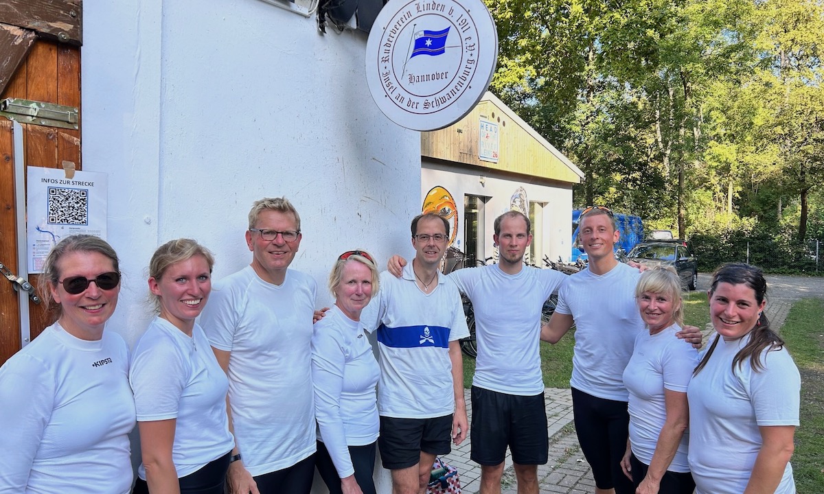 Allerdings musste die Obfrau vor dem Start ein nicht unwichtiges Debakel lösen: Der Veranstalter hatte den Hanseaten einen Riemen-Renn-Achter zugewiesen. Keiner aus dem Boot hatte je Riemen gerudert und schon gar nicht in einem Rennboot. Aber die Regattaleitung zeigte sich wie immer flexibel und steckte uns in einen anderen Lauf, wo ein Leih-Gig-Doppelachter zur Verfügung stand. Das hieß aber für uns eine Verschiebung der Ablegezeit von 11:45 Uhr auf 15:05 Uhr sowie Wartezeit am Start auf der Ihme.
