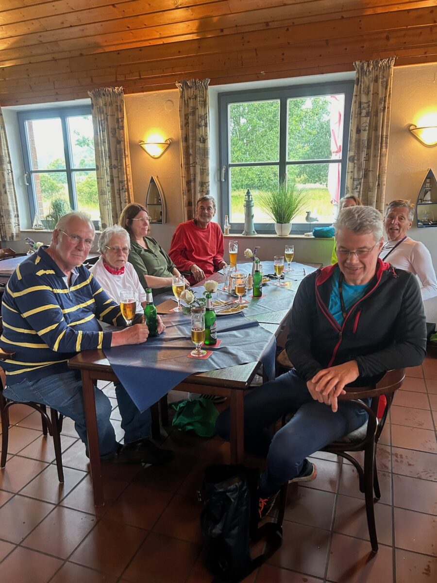 Völlig durchnässt wurden wir trotzdem herzlich in der Gaststätte am Wassersporthafen Hasenbüren begrüßt und durften sogar mit nassem Gesäß auf den gepolsterten Stühlen Platz nehmen. Und siehe da: Unsere Novizen waren bestens auf die Wetterlage vorbereitet und hatten in den Seesäcken trockene Klamotten dabei. Da staunte so manch erfahrener Ruder:in.